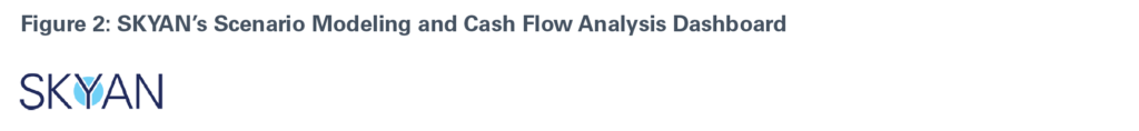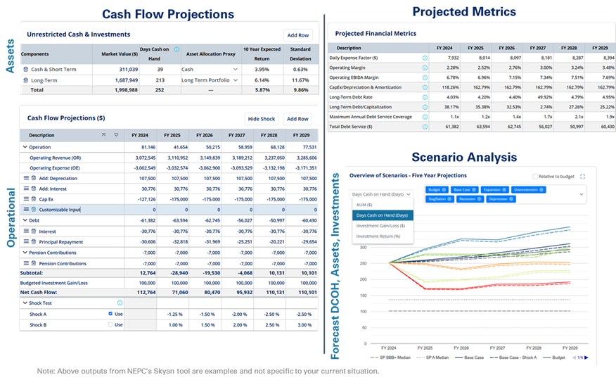 This figure illustrates SKYAN’s core capabilities, combining cash flow projections with scenario-based forecasting. On the left, the dashboard displays detailed projections of unrestricted cash and investments, including asset allocation and expected risk-return metrics, alongside cash flow projections specific to a given system. On the right, scenario analysis charts compare five-year projections for total assets, days cash on hand (DCOH), and investment returns across various economic scenarios to provide a clear view of potential outcomes relative to budget assumptions. Please see additional disclosures at the end of these materials.