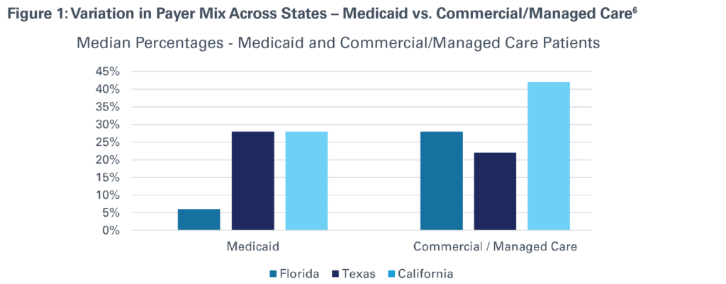 We have analyzed three sample states, California, Texas, and Florida, to illustrate how geography and payer mix intersect. While hospital systems within each state vary by size, payer mix and financial performance, the aggregate data reveals notable dispersion by state. In this sample (Figure 1), it is clear that Texas and California are significantly more reliant on Medicaid relative to systems in Florida, which have a much higher median share of commercial and managed care patients.